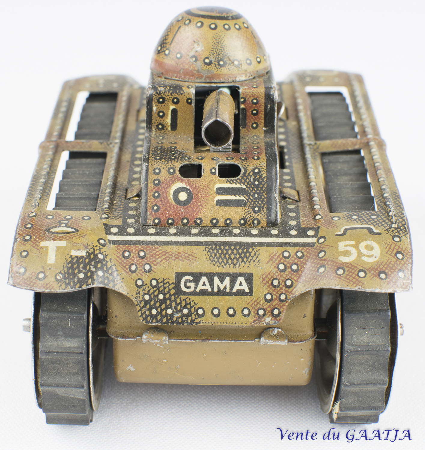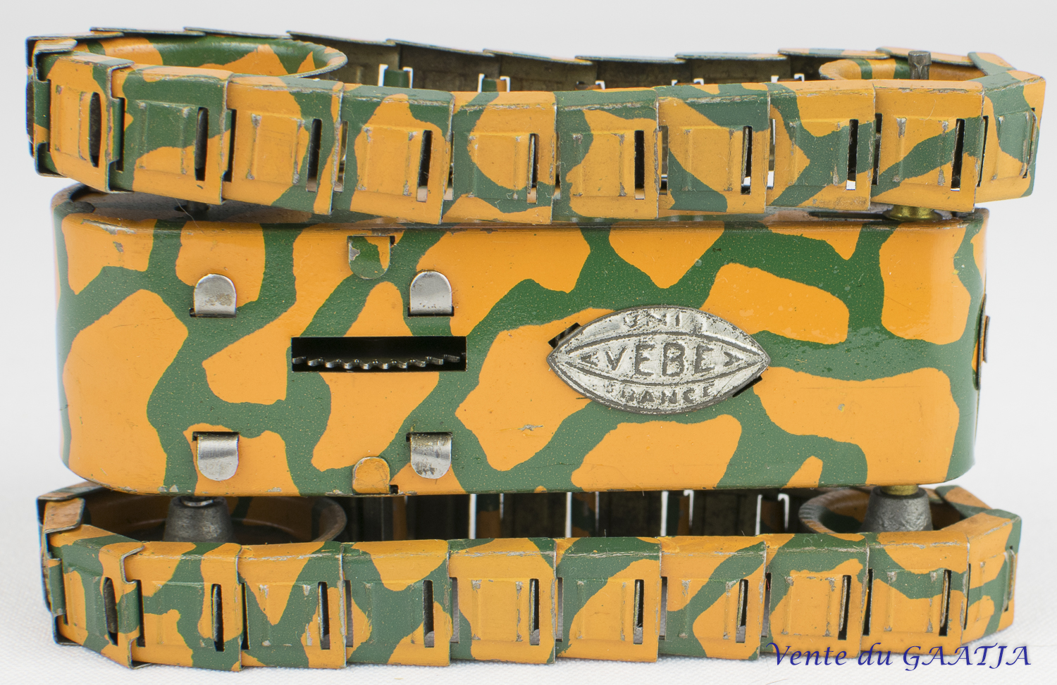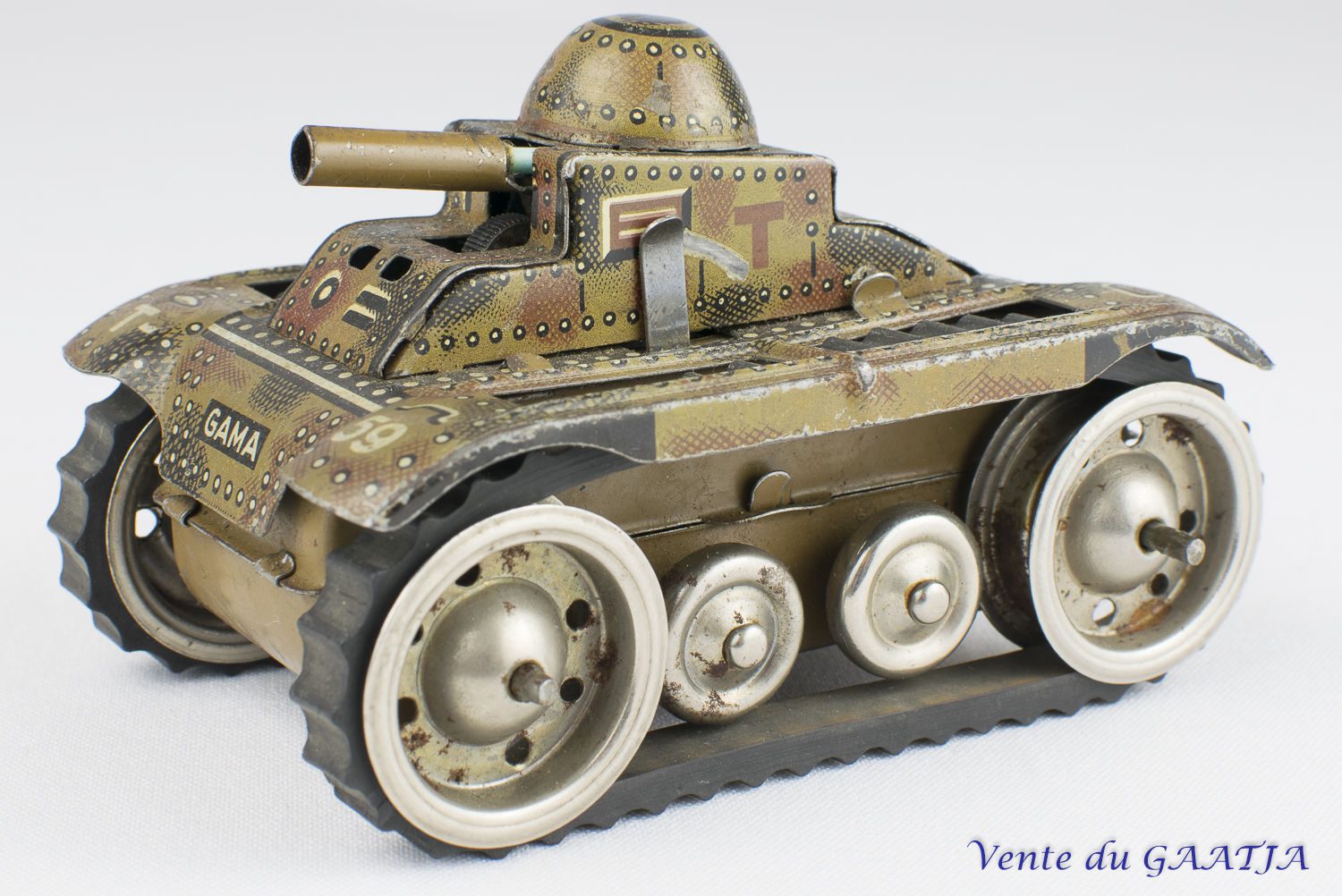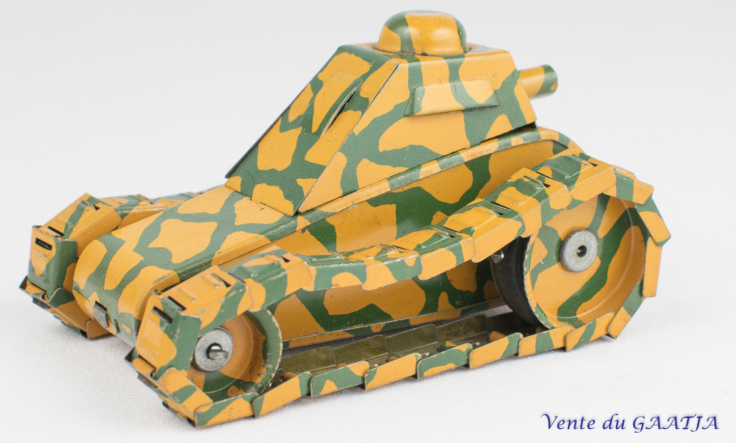 mécanique, motif camouflage Manque les deux chenilles & petit enfoncement au niveau du canon. Pas de clé. Fonctionne. 15 cm 50 Eur. + frais d'expédition (Tarif B) Réf. "JM32" |